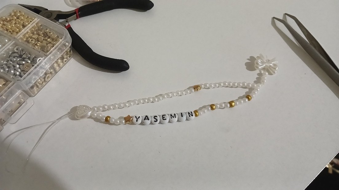 Parlak altın detaylı, boncuklu beyaz el zinciri. "Yasemin" harfli kişiye özel boncuklar içerir. Minimalist bohem tarzda, hafif yılan desenli. ✨