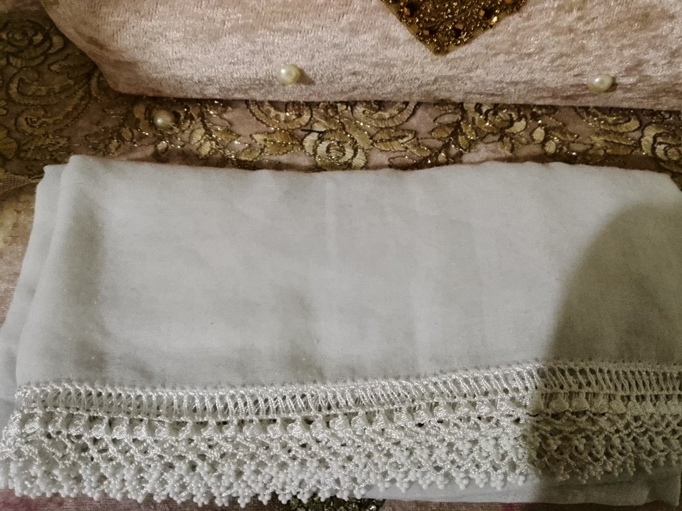 Beyaz renkte, dantel detaylı ve parlak görünüme sahip vintage tarzda kadın yazma Yumuşak tekstil malzemeden üretilmiştir.