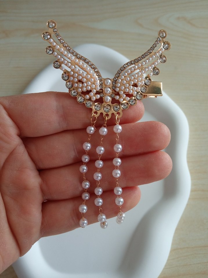 1 adet fiyatıdır .Boncuklu beyaz kanat şeklinde saç tokası, sarkan inci zincirlerle. tarzı yansıtıyor. ✨