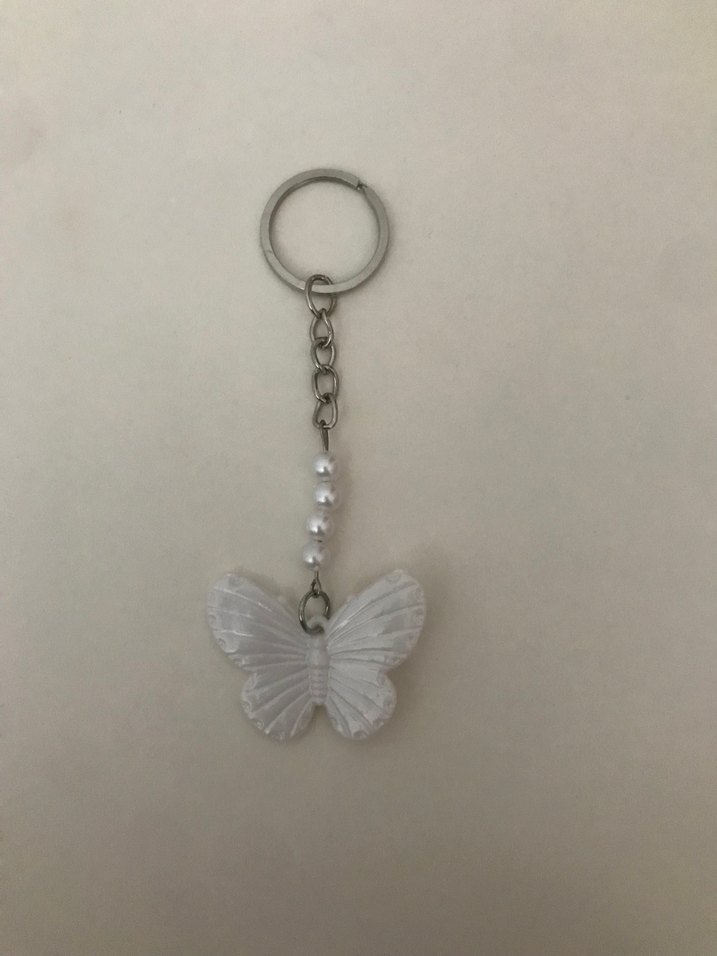 Boncuklu beyaz kelebek figürlü, sade ve bohem tarzda anahtarlık.