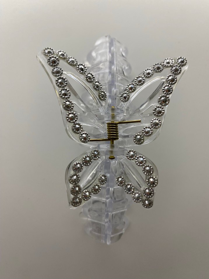 Boncuklarla süslenmiş beyaz plastik kelebek şeklinde saç tokası, modern bir görünüm sağlar.