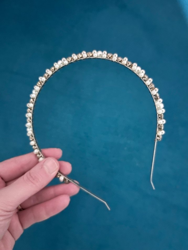 Bu beyaz metal taç, ince boncuk detaylarıyla bohem ve retro tarzlara ışıltılı bir dokunuşnişam katıyor. Hippie stiline uygun. Bir kere kullanıldı nişanda 3 saat kadar