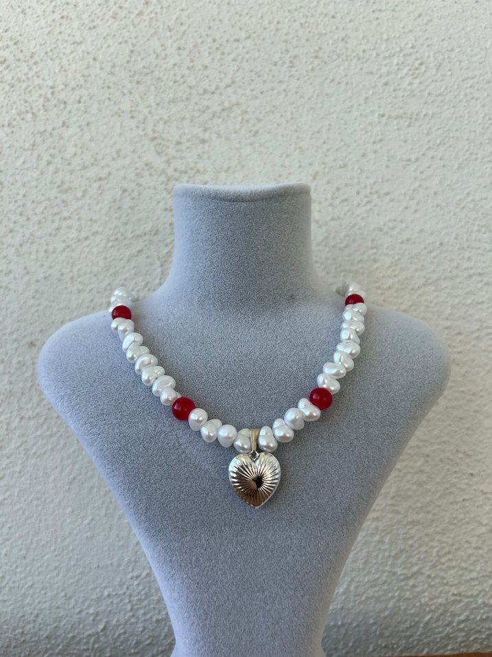 Kısa beyaz boncuklu, işlemeli detaylı ve kalp şeklinde kolyesi ile romantik gece için sade bohem tarzda kadın kolyesi.