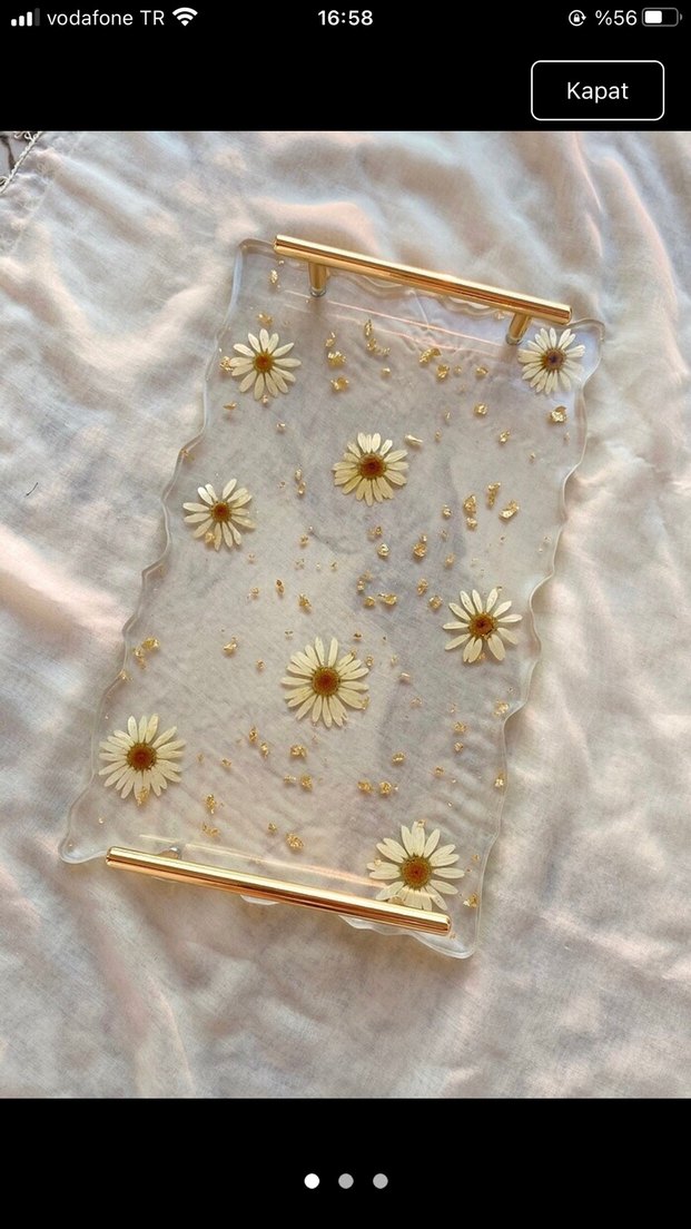 Bohem tarzda, El yapımı beyaz papatya ve boncuk detaylı, altın renkli aksanlı şeffaf sunum tepsisi