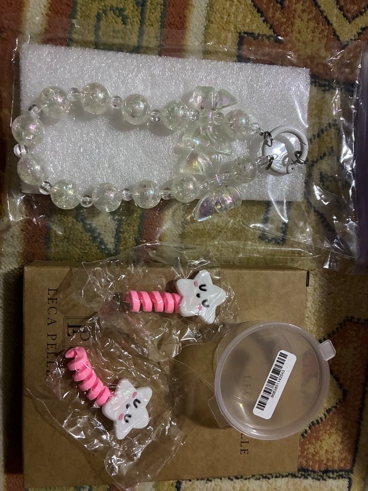 Şeffaf boncuklu beyaz bileklik ve pembe beyaz yıldız figürlü kablo koruyucudan oluşan telefon aksesuarları seti. Ürünler sıfır olup etiketli ve kullanılmamıştır. Yakın çekim yapmaya çalıştım charmın boncukları çizik kendiliğinden öyleydi