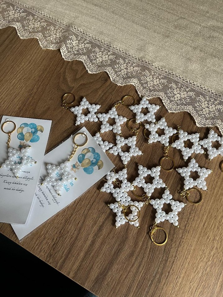 Bohem tarzda, yıldız şeklinde beyaz boncuklardan yapılmış anahtarlıklar, retro bir dokunuş katıyor. nişan söz nikâh sünnet tüm özel günlerimizde farklı ürünler ile adet fıyatları