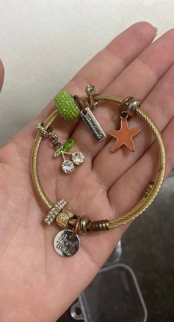 Boncuklu ve nakış detaylı, yıldız ve kiraz figürlü çeşitli charm'larla süslü bohem tarzda altın renk bileklik.