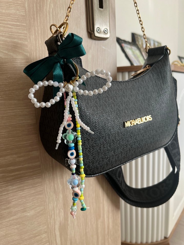 Renkli boncuklar ve fiyonk detaylı, bohem tarzı anahtarlık, gri Michael Kors çantaya takılıdır.