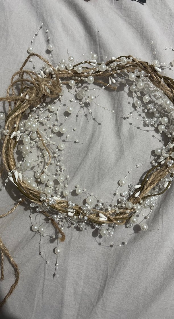 Boncuklu, bej renkte, örgü kumaştan bohem tarzı saç aksesuarı, inci detaylarıyla retro ve hippie tarzlara uyum sağlar.