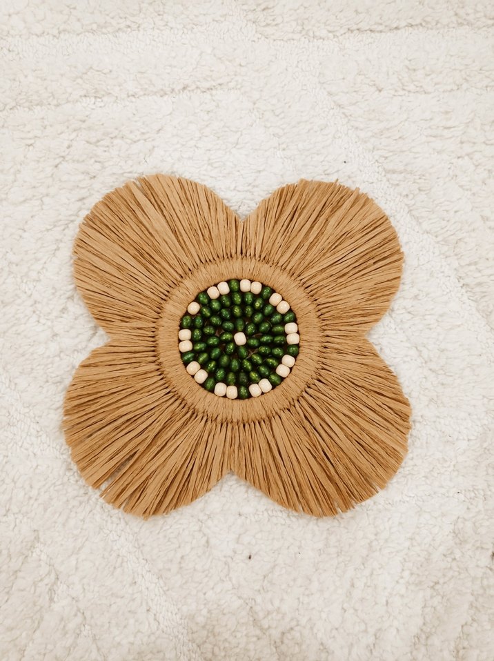 Bohem tarzda, ortasında yeşil ve ahşap boncuklar bulunan doğal liflerden yapılmış çiçek duvar süsü.