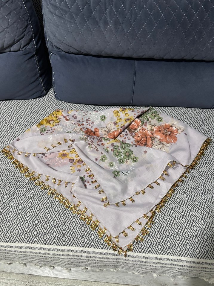 Çiçek desenli ve boncuklu kenarları olan çok renkli, bohem tarzda kadın yazması. Yumuşak tekstil kumaştan yapılmıştır, retro ve hippie havası taşır.