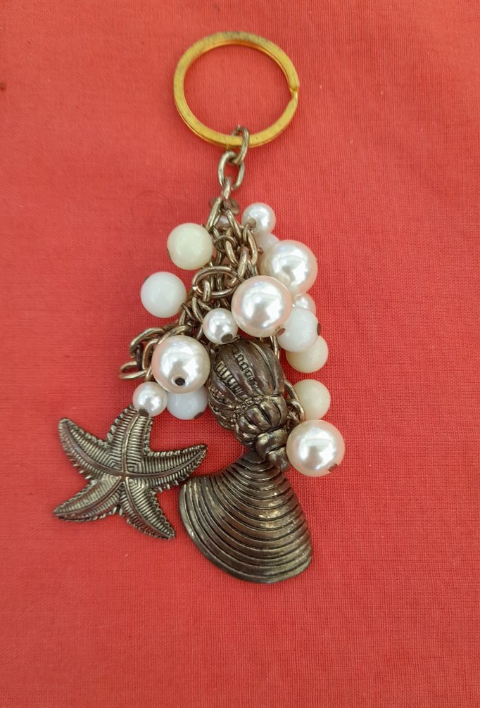 Boncuklu ve vintage deniz temalı figürlere sahip bohem tarzı anahtarlık. Beyaz ve metalik renklerde.