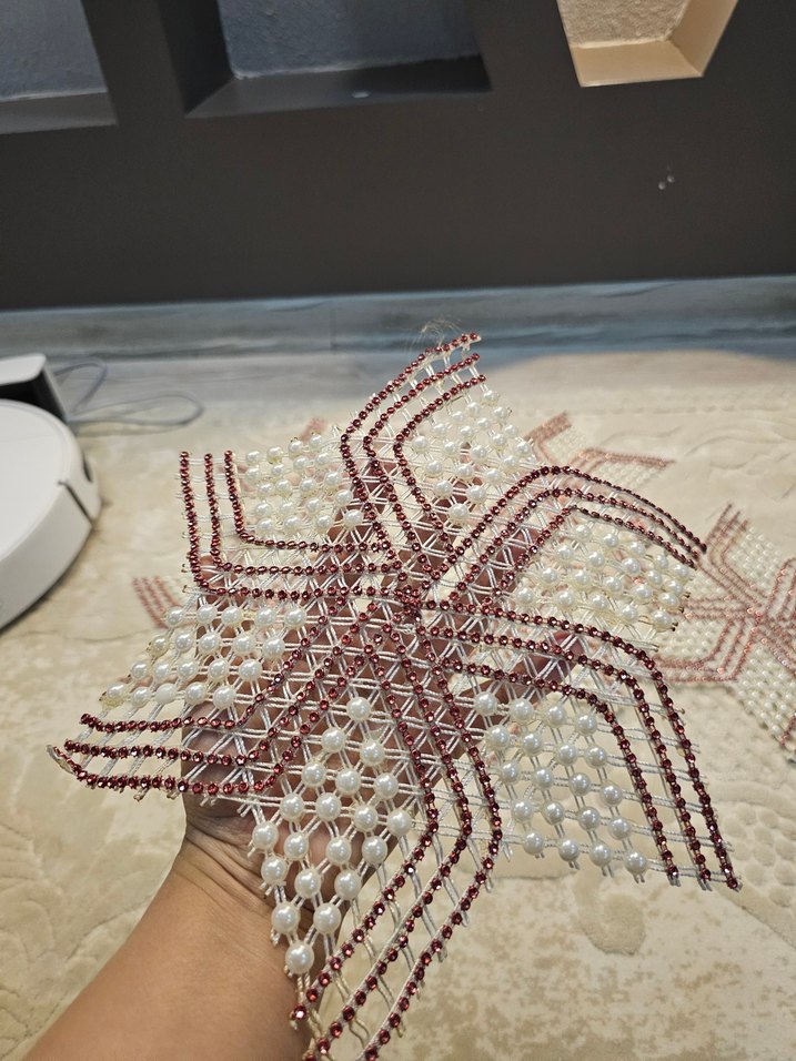 Beyaz ve kırmızı boncuklarla yapılmış, yıldız şekilli el yapımı bohem tarzda dekoratif örgü. ✨hic kullanilmadi