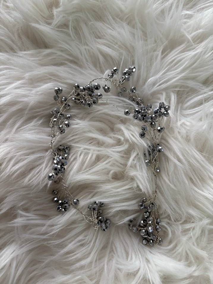 Bohem tarzda, gri boncuklarla süslenmiş örme kumaştan kadın saç aksesuarı. Glamour ve retro havası ile hippie stilini tamamlar. ✨