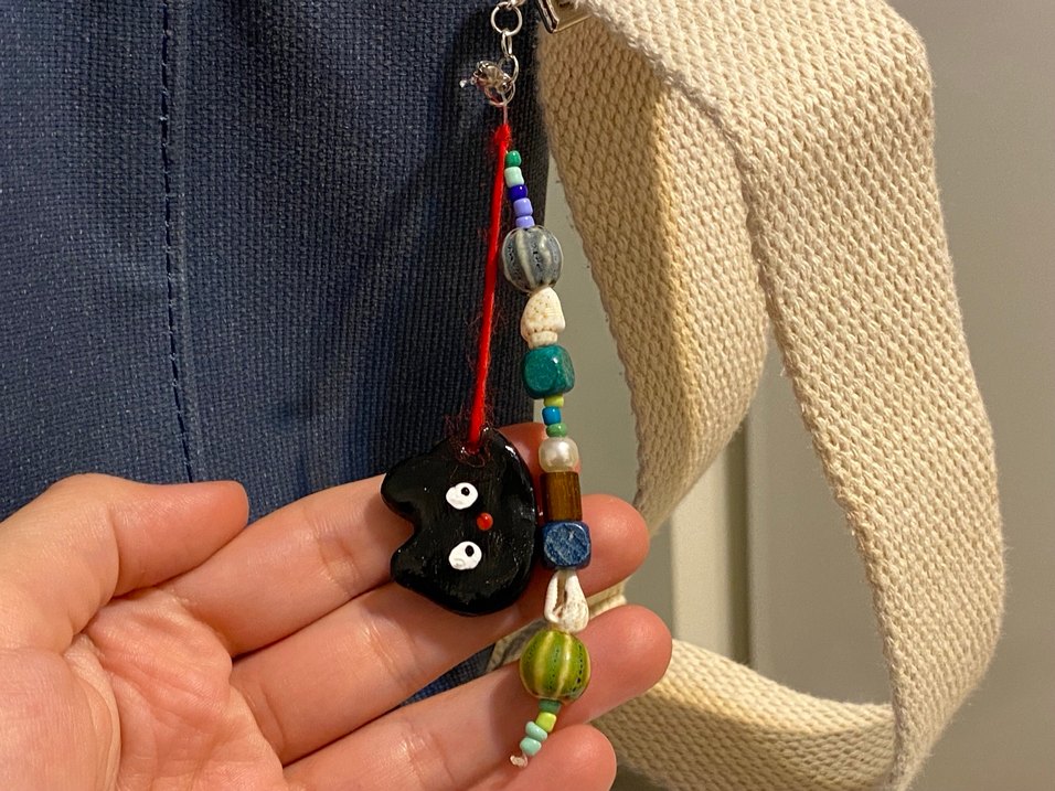 El yapımı kille yapıldı Kırmızı ipte çok renkli boncuklar ve koyu renkli kedi figürlü bohem tarzda kadın anahtarlık.