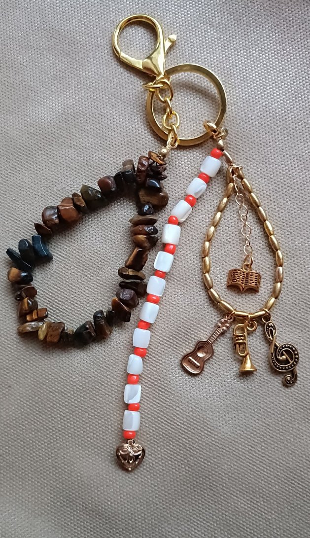 Bohem tarzı kadın anahtarlık, koyu boncuklu ipler ve kitap, gitar, trompet ile müzik notası şeklinde altın renkli figürler içerir.Kırıktaş, sedef boncuk ve gold aparatlar kullanılmıştır
