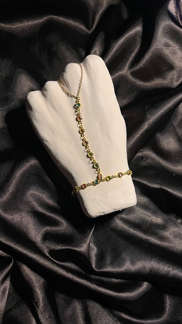 Çok renkli boncuklarla süslenmiş, yılan desenli bohem tarzda kadın el zinciri. Düğün ve avangart görünümler için uygundur.