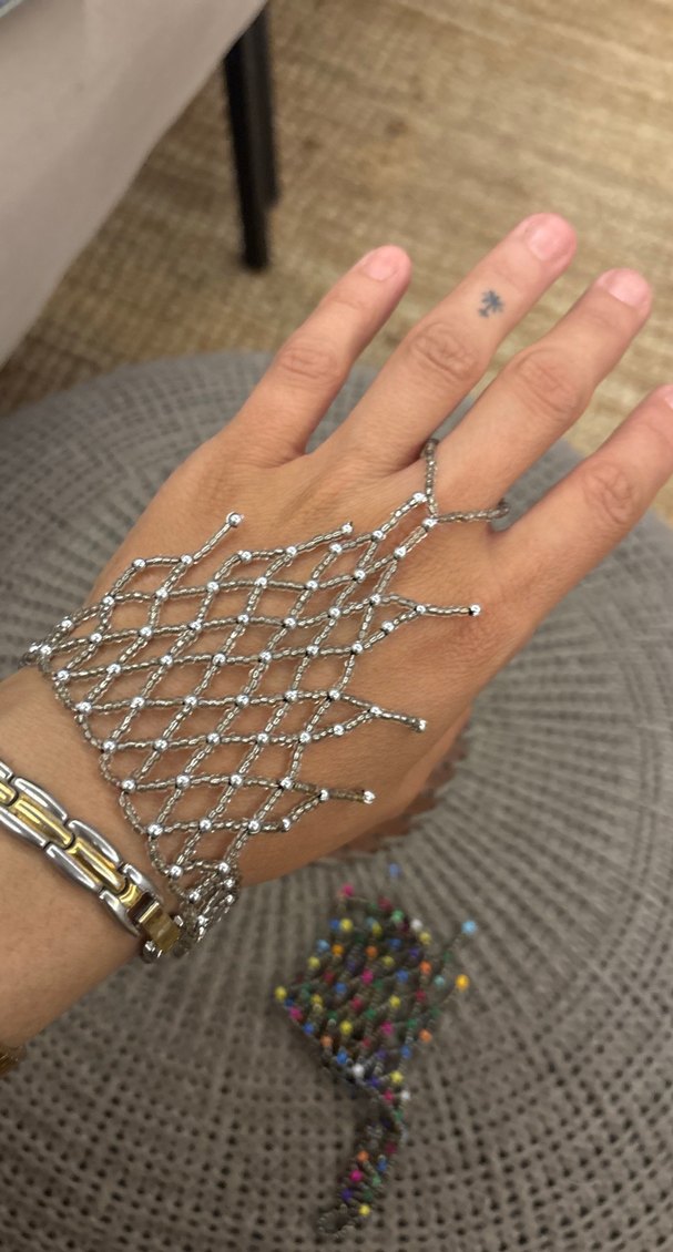 Boncuklu ağ tasarımlı, gri ve altın renk detaylı bohem tarzı kadın el zinciri, günlük kullanıma uygundur. ️