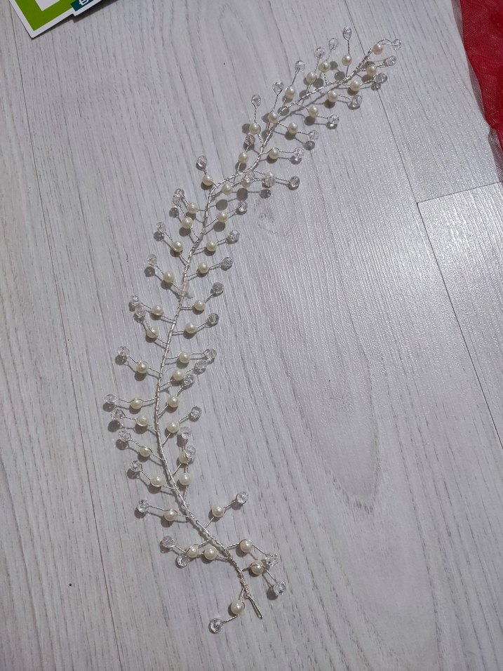Beyaz ve gri tonlarda, boncuklu örgü kumaştan yapılmış bohem kadın saç aksesuarı, minimalist ve retro stiller için uygun.