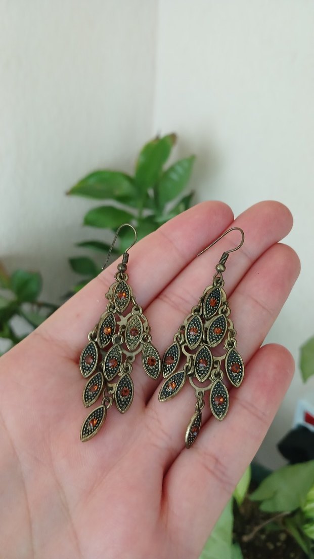 Boncuklu, desenli ve koyu haki tonlarında bohem tarzda midi uzunlukta günlük kullanıma uygun küpeler.