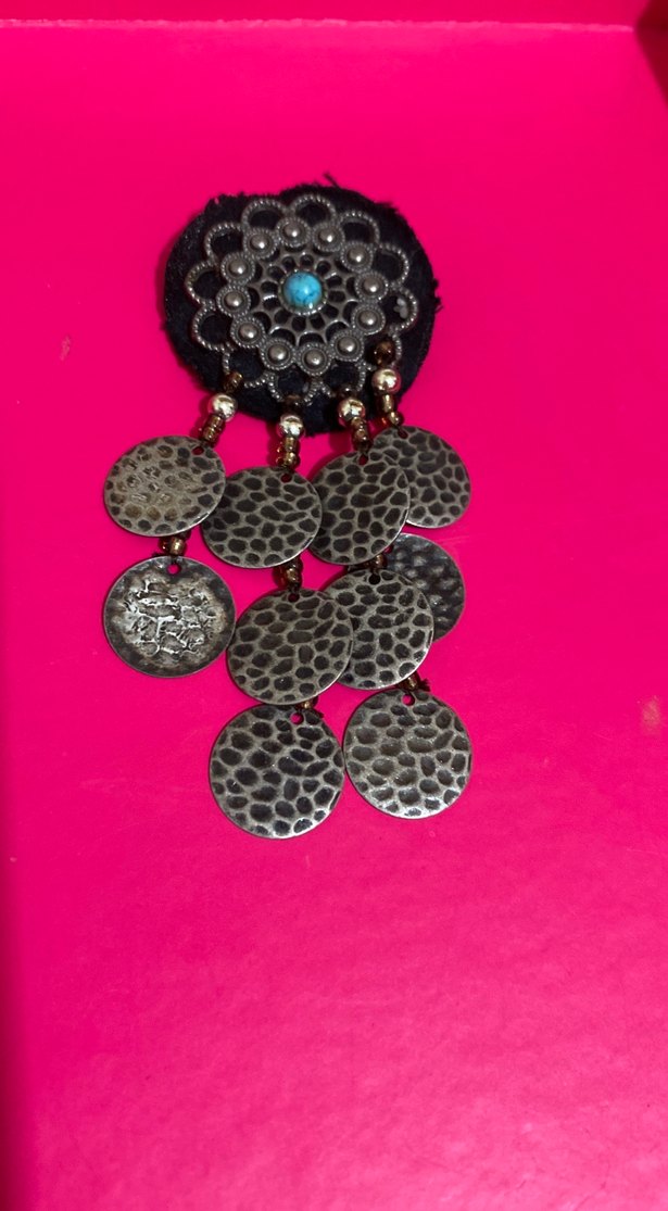 Boncuklu detaylara ve turkuaz renkli nakışa sahip bohem tarzda broş. Dövme metal disklerle retro ve hippie havası taşır, parti için uygun.