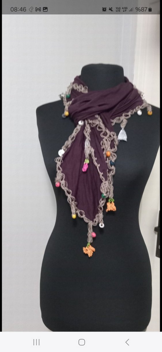 Koyu renkli, çok renkli örgü kumaştan yapılmış ve boncuk detaylarıyla süslenmiş bohem tarzda kadın fular.