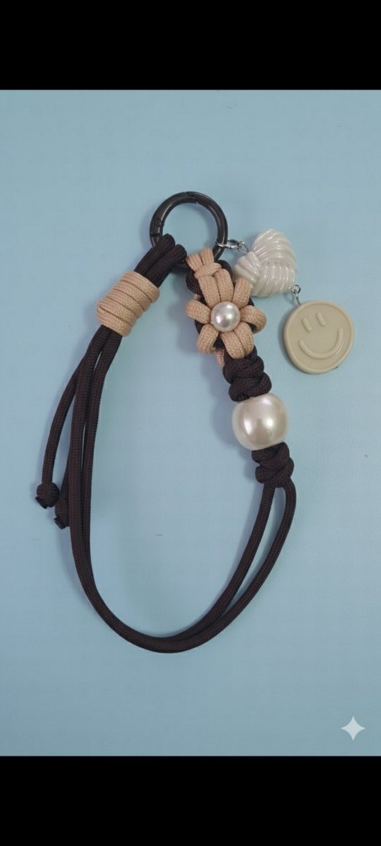 Çiçek detaylı, inci süslemeli ve gülen yüz figürlü boncuklu bej bohem tarzı anahtarlık.