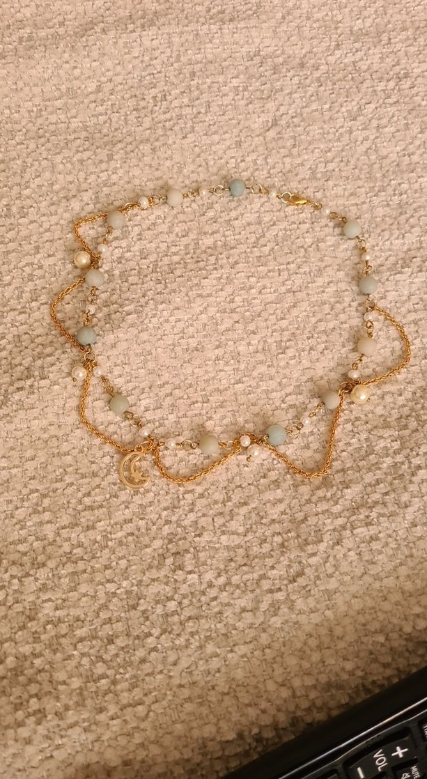 Altın renkli, pastel boncuklu ve nakış desenli uzun kolye, bohem tarzı için uygundur.