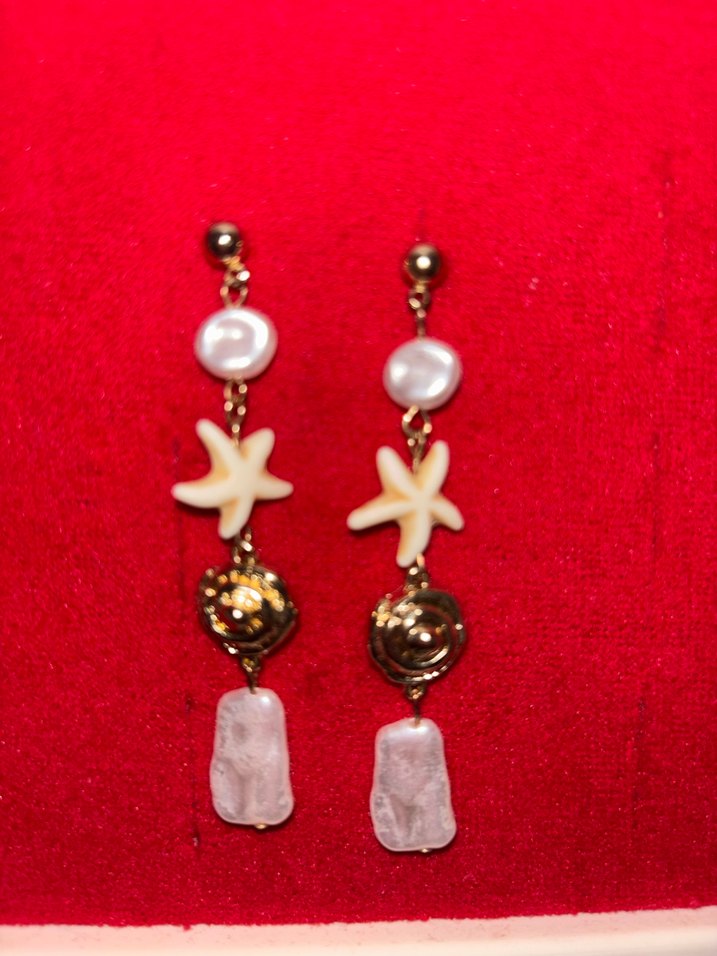 Deniz yıldızı ve inci detaylı uzun boncuklu küpeler, plaj için bohem tarzda. Renkli ve nakışlı tasarımıyla göz alıcı.