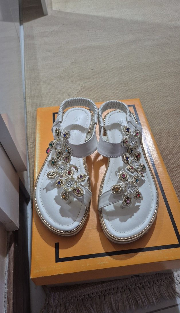 Beyaz renkte, boncuk detaylı çiçek desenli, lastik malzemeden dolgu topuklu sandaletler. Bohem tarzda, hafif ve günlük kullanıma uygun.
