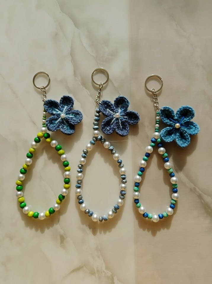 Renkli boncuklardan oluşan, çiçek figürlü örgü detaylı, bohem ve minimalist tarzda kadın anahtarlıklar. Her anahtarlıkta boncuklu halka ve çiçek süs bulunur.