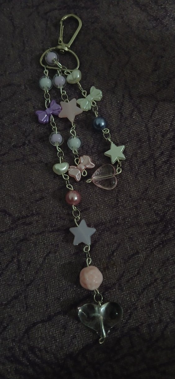 Bu kadın charm, yıldız, kalp ve kelebek gibi şekillerde pastel renkli boncuklar ve metal zincirlerle tasarlanmıştır. Bohem ve avangart tarzı yansıtır, partiler için uygundur.
