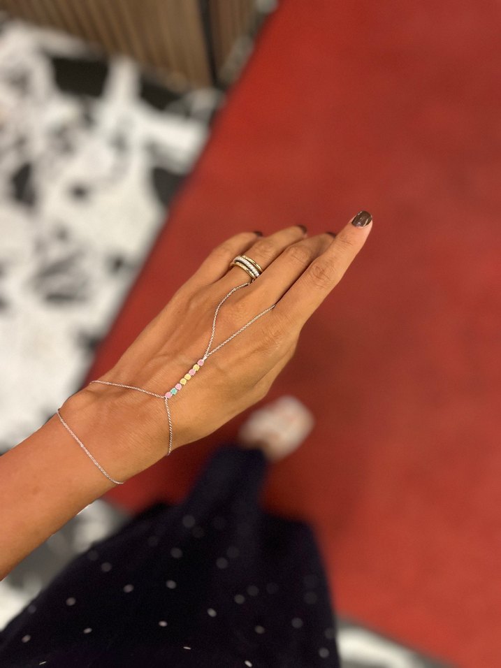 Minimalist bohem tarzda, çok renkli boncuklarla süslü ince gümüş el zinciri, günlük kullanım için uygundur. ✨