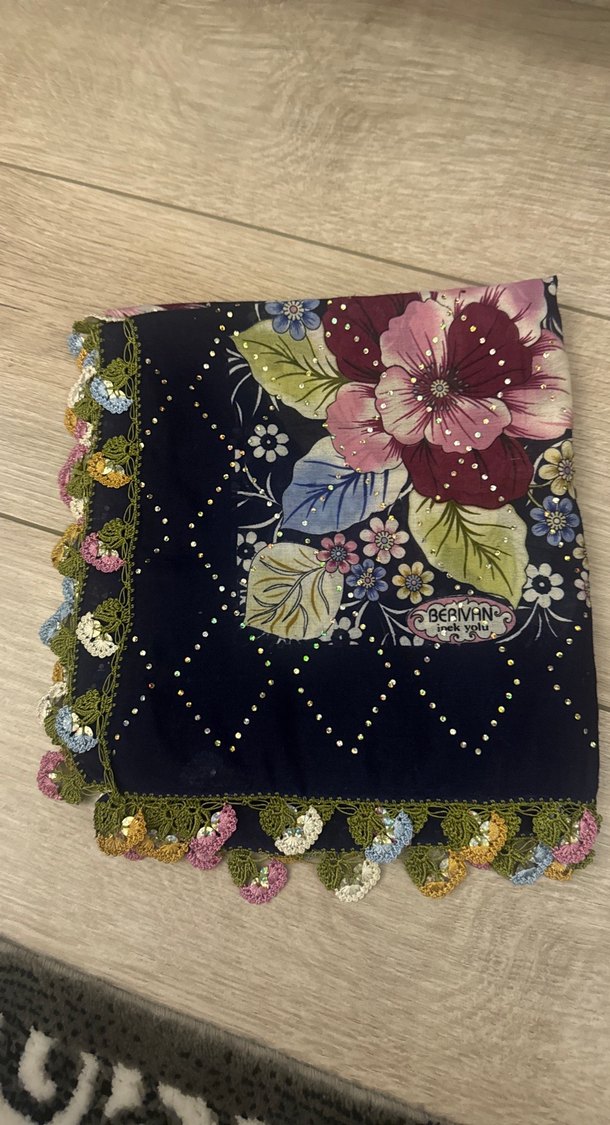 Kadınlar için çok renkli çiçek desenli, koyu renkli tekstilden yapılmış, boncuk detaylı ve renkli tığ işi kenarlıklı bohem fular.