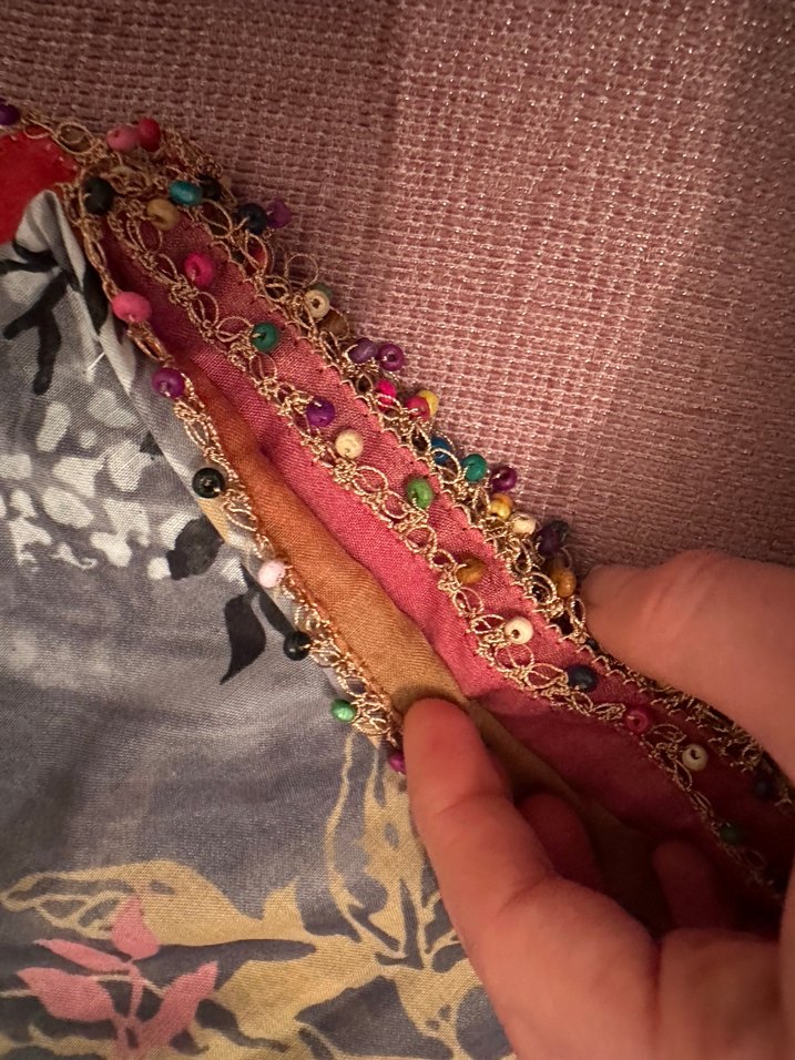 Yumuşak tekstil kumaşından, kenarları parlak çok renkli boncuklarla süslenmiş bohem tarzda kadın fuları.