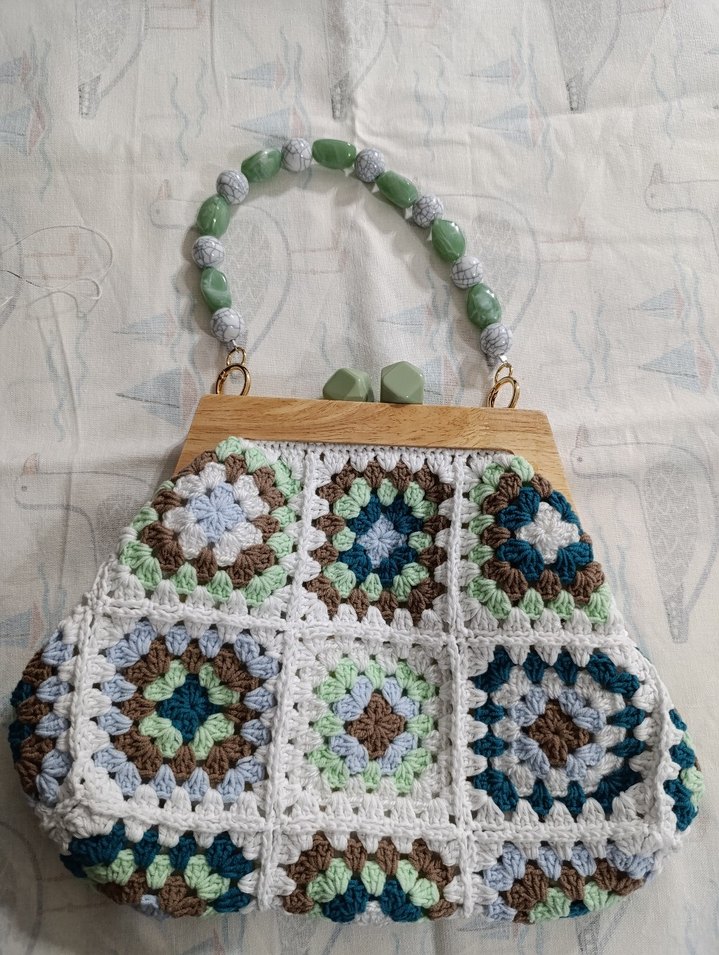 Bohem tarzda, çok renkli desenli örgü kadın çantası. Yeşil ve beyaz boncuklu sapı ile retro ve hippie havası taşıyor. Günlük kullanıma uygundur.