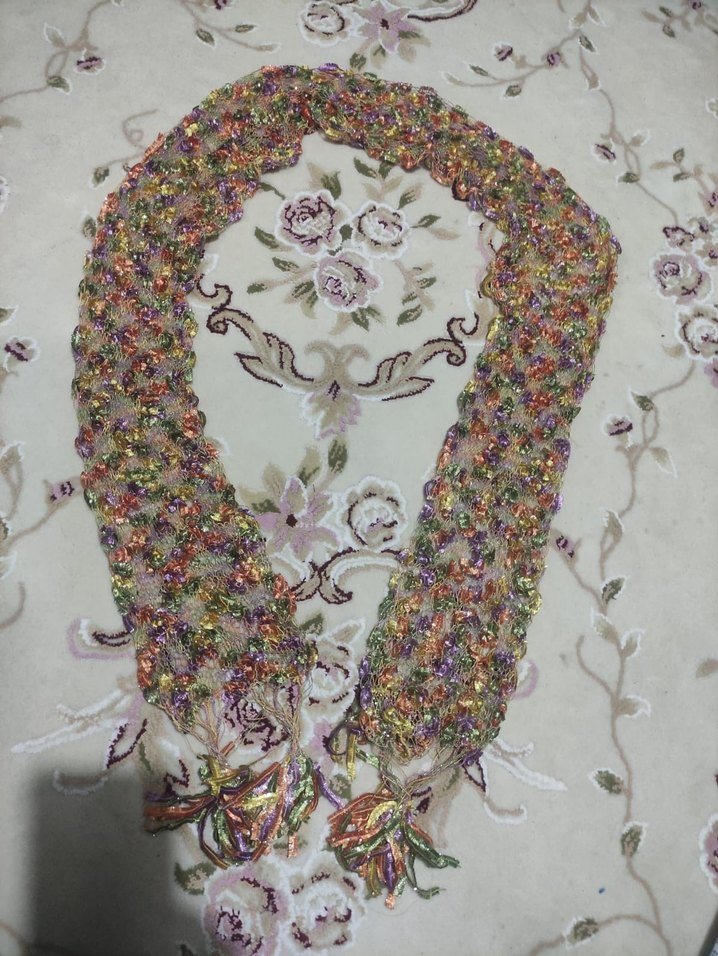 çok renkli örgü kumaştan yapılmış, bohem tarzı kadın atkısıdır.