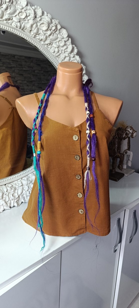 Boncuklu, çok renkli, örgü yapıda koyu tonlarda bohem tarzda saç aksesuarı.