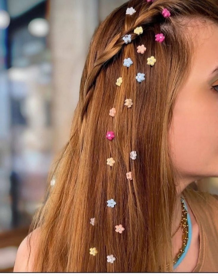 Pastel renklerde küçük boncuklu çiçeklerle süslenmiş örgü saç aksesuarı, bohem tarz için uygun.