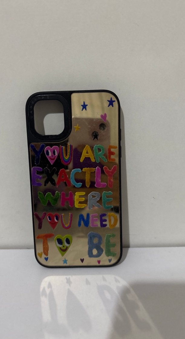 Koyu tonlarda çok renkli, boncuklu ve pop kültür tarzında telefon kılıfı. Üzerinde "YOU ARE EXACTLY WHERE YOU NEED TO BE" yazısı renkli harflerle yer alıyor. İPhone 11 uyumlu