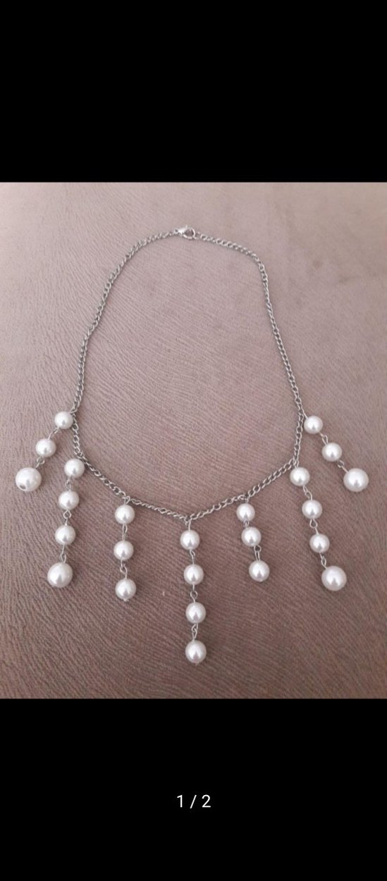 Bohem tarzda, gri zincir üzerinde sarkıt şeklinde dizilmiş beyaz boncuklardan oluşan, günlük kullanıma uygun şık kolye.