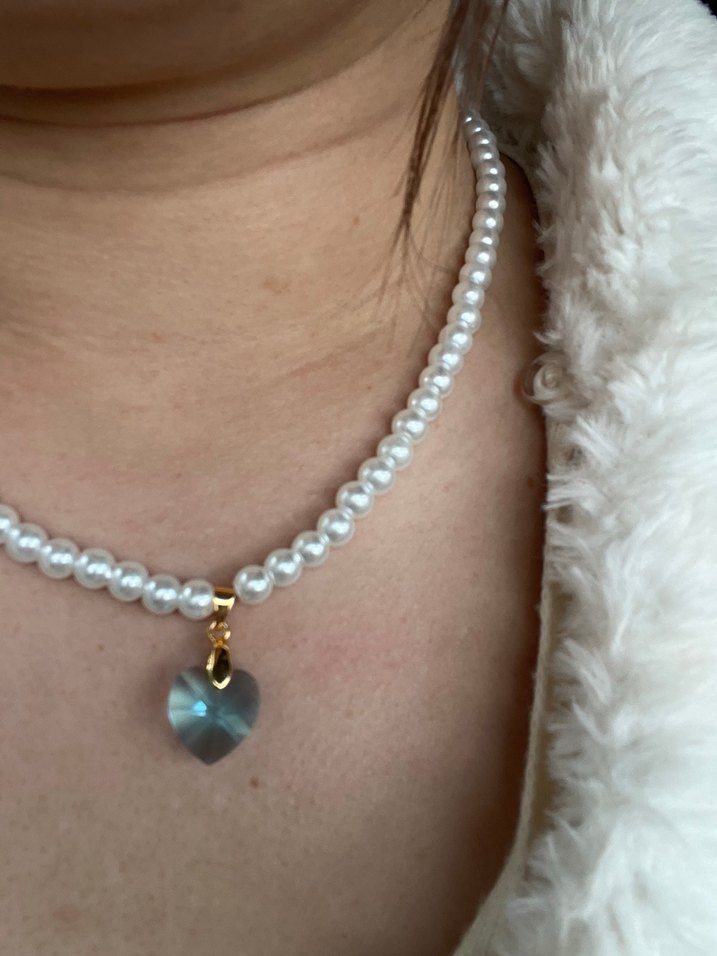 Gri boncuklardan oluşan, kalp şeklinde bir kolye ucu ile sade ve bohem tarzda midi uzunlukta kolye. Romantik akşamlar için uygundur.