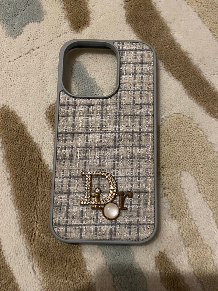 Gri renkli, dokulu kumaş görünümlü ve boncuklu 'Dr' harf süslemeli telefon kılıfı, street wear tarzını şık detaylarla buluşturuyor.