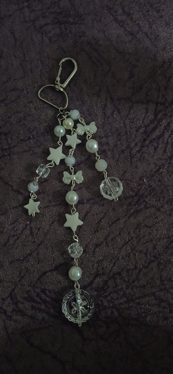 Gri yıldız ve inci görünümlü boncuklardan oluşan, gotik ve bohem tarzda bej tonlarında avant-garde anahtarlık.