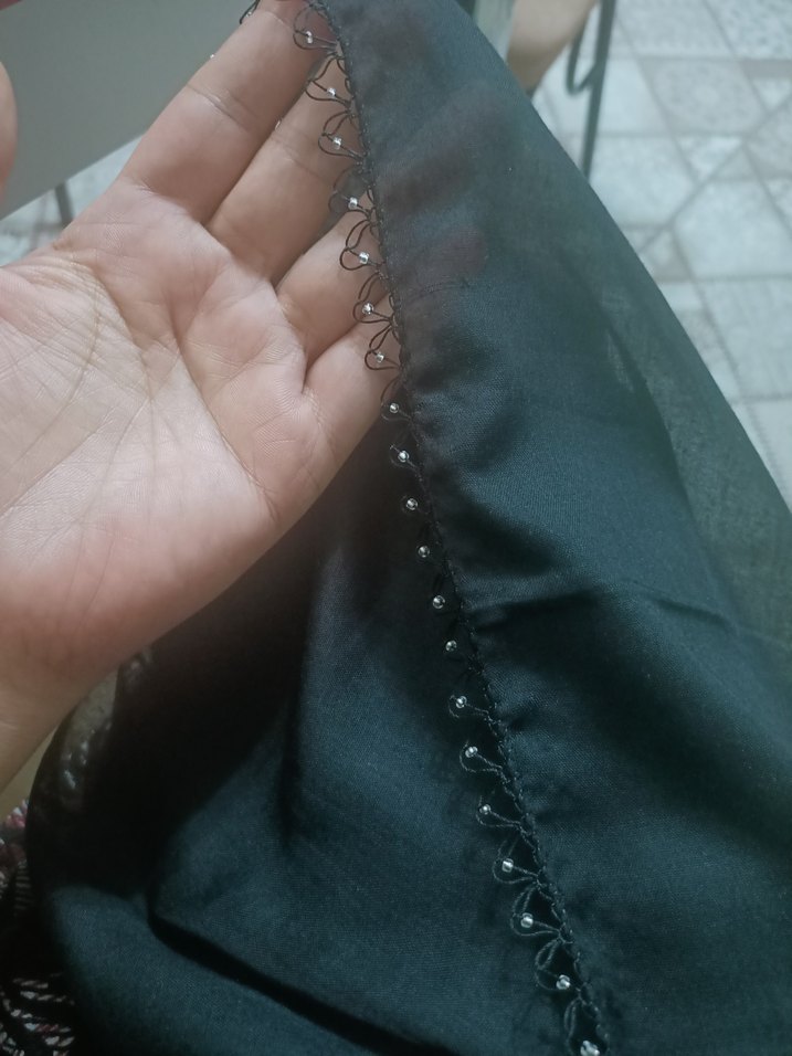 iğne oyasıdır dört kenarıda yapılır elimde başlıdır isteyene tamamlayıp kargolaya bilirim marka reyyan tek renk siyah yazmadır boncukla suni ipek iple işlenmiştir