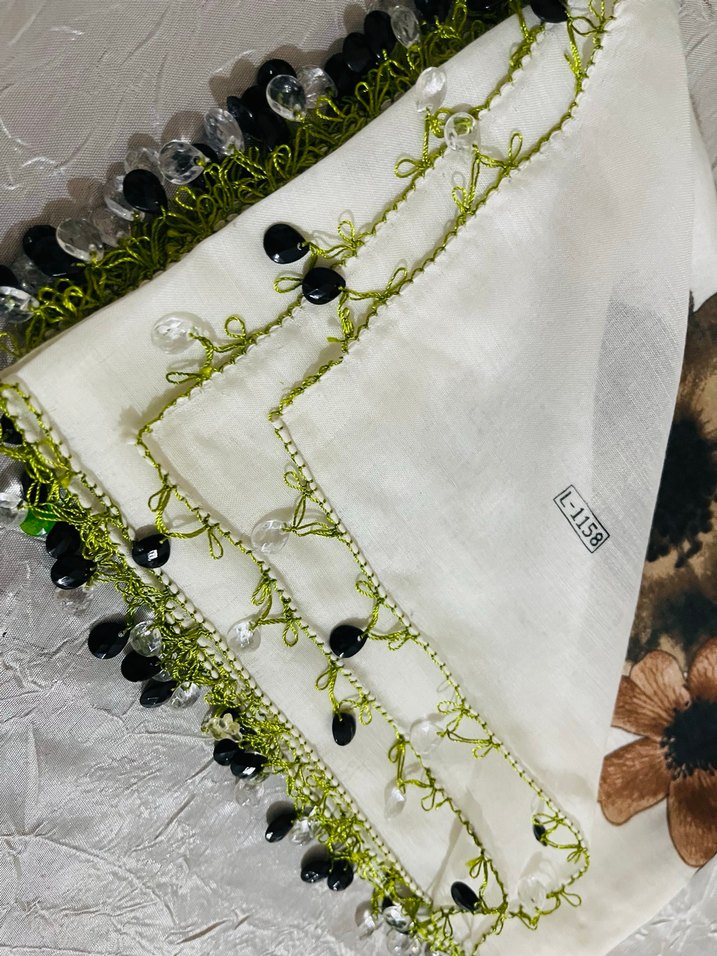 Beyaz tekstil kadın fuları, boncuk işlemeli ve bohem tarzdadır. İnce yeşil iplik detayları ve koyu boncuk süslemeleri bulunur, 'L-1158' etiketi vardır.