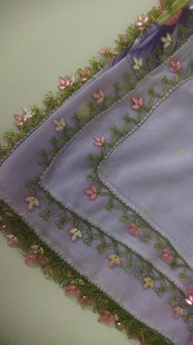 Pastel mor renkte, dantel işlemeli kenarlarıyla bohem ve retro tarzı yansıtan yumuşak dokulu kadın fularıdır.