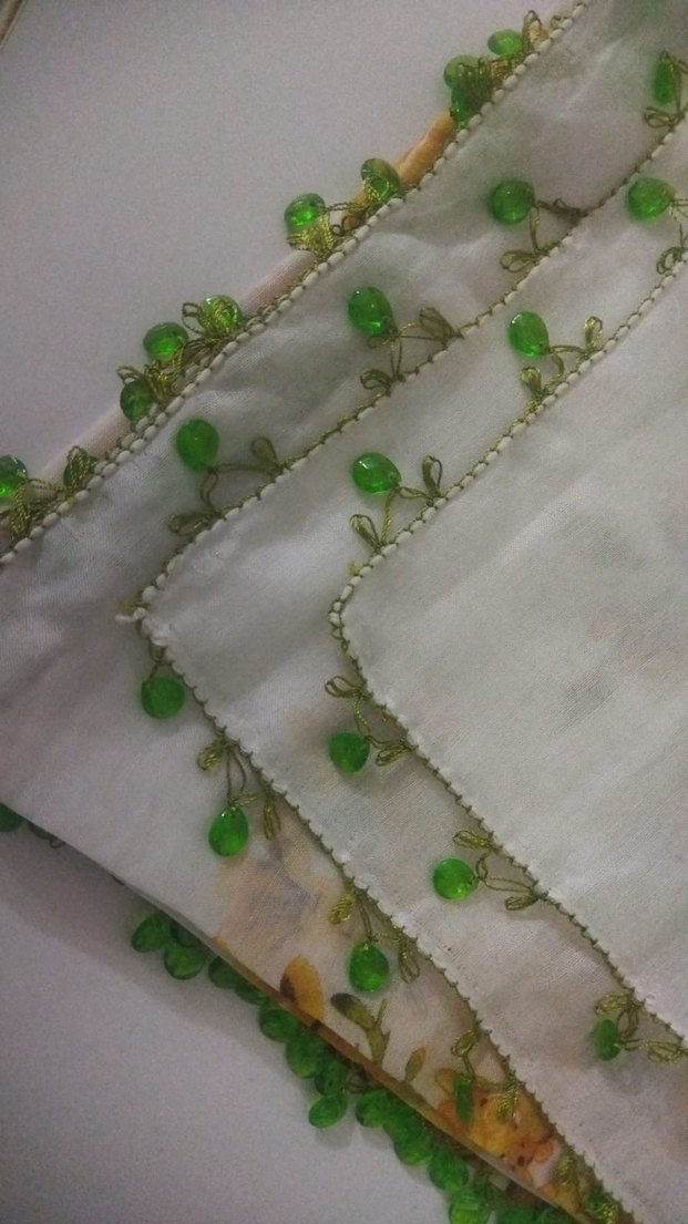 Tekstil kumaştan yapılmış, boncuk işlemeli ve parlak yeşil detaylara sahip bohem tarzda kadın şalı.