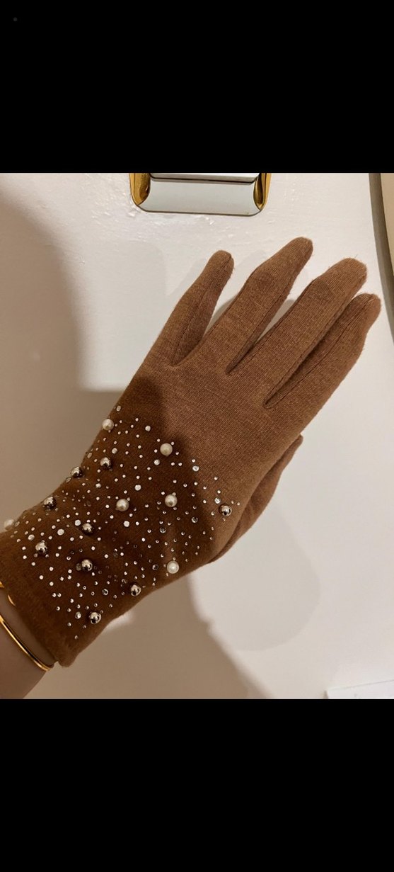 Kahverengi, boncuk ve inci detaylı, örgü kumaştan yapılmış, bohem tarzda kadın eldiveni. Rahat ve şık bir görünüm sunar. ✨Telefon algılıyor