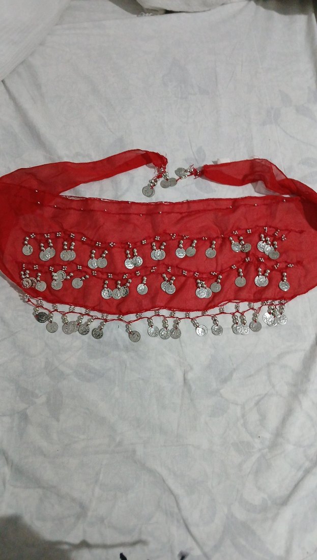 Kırmızı renkli, boncuklu ve metal para detaylı bohem tarzda kadın fularıdır. Yumuşak sentetik kumaştan yapılmıştır, renkli ve retro bir görünüm sunar.